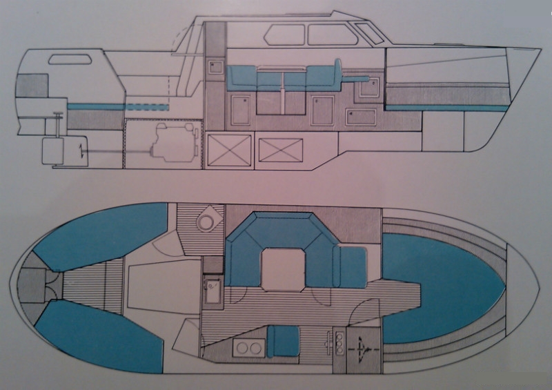 Motorn ligger delvis nedsänkt i kölen. Det gör att man kan sänka golvhöjden och skrovtypen utan att ha motorn ivägen. På så sätt får man en låg tyngdpunkt. Den platta undersidan i aktern fungerar som ett fast trimplan.